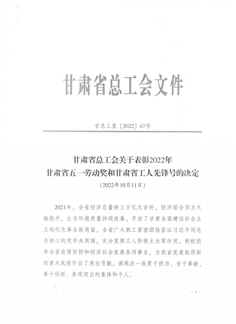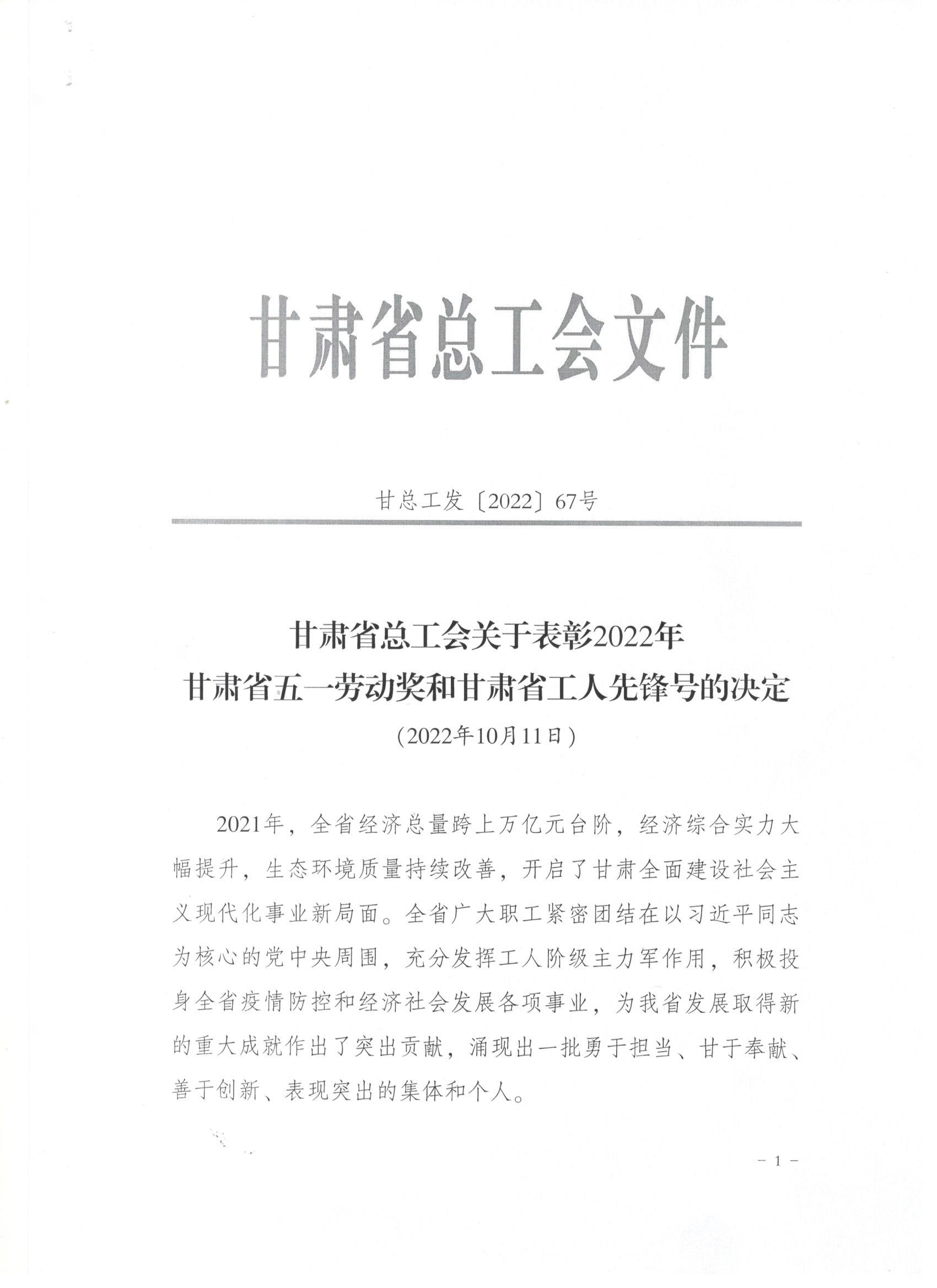 近日,甘肅省總工會(huì)發(fā)布了《關(guān)于表彰2022年甘肅省五一勞動(dòng)獎(jiǎng)和甘肅省工人先鋒號(hào)的決定》,我司被授予“甘肅省五一勞動(dòng)獎(jiǎng)”和“甘肅省工人先鋒號(hào)”。